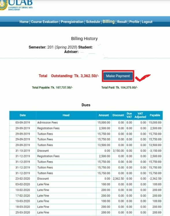 3. City Bank Skypay: If you want to pay using a card you have to click on “Make Payment” on the billing system in the URMS. Please find attached a screenshot where you have to click & pay.