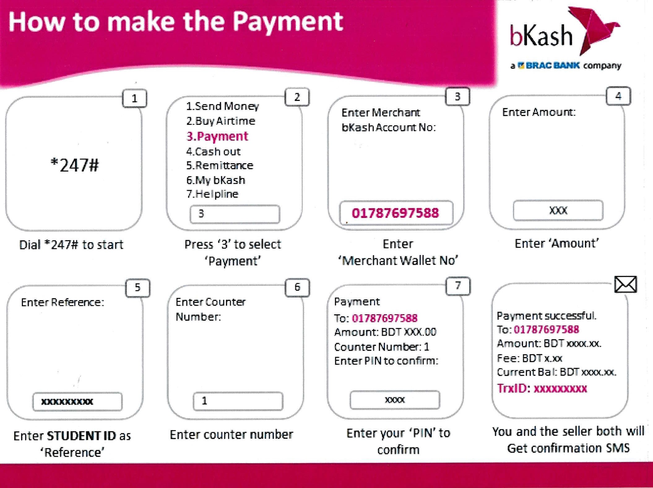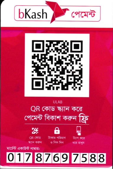 2. bKash: If you want to pay through bKash, the merchant bKash number of ULAB is 01787697588. Please find the following Payment Steps (in step five, write ULAB ID must) for your information.